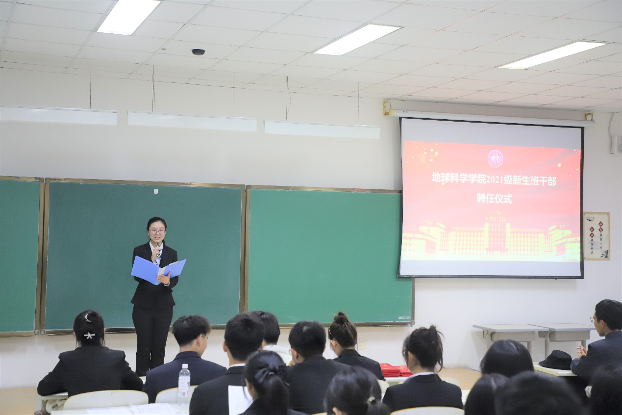 2021年10月31日晚,必赢bwin线路检测中心2021级本科新生班干部聘任仪式在李四光楼310教室顺利举行,参加仪式的有团委书记兼2021级辅导员韩旭老师、2020级辅导员助理以及2021级新任班干部。本次会议由姚欣欣同学主持。