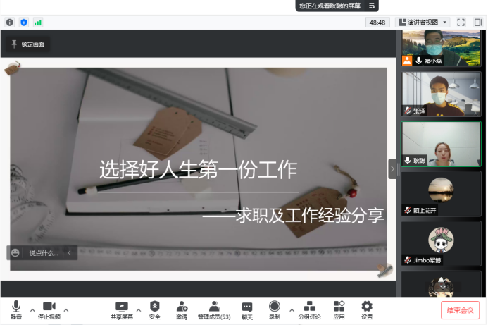2021届硕士毕业生耿聪同学结合地学专业特点,抓住机会,成功就业于规划建筑设计研究院。她以《选择好人生第一份工作——求职及工作经验分享》为题,为大家介绍了她的求职经验和工作体会。她表示,同学们要明确自己的求职意向,结合自身情况定位求职方向,要提前为秋招做好准备。同时她也向大家提供了简历撰写的指导,其中包括自己的个人信息、实习经历、校园实践等。最后她建议大家要做好公司笔试和面试的训练,打有准备的仗,实现精准求职,稳定就业。