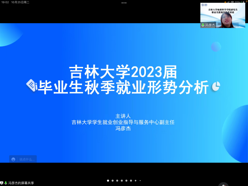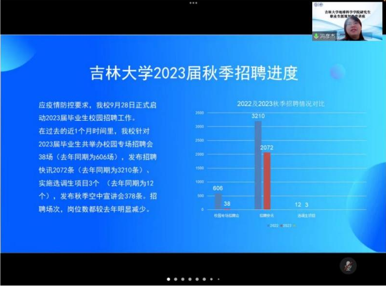 10月25日,学院邀请学校学生就业创业指导与服务中心副主任冯彦杰老师,以“必赢bwin线路检测中心2023届毕业生秋季就业形式分析”为题,为学院157名研究生新生线上讲授了一场以就业数据分析为基础,案例分析为辅导,实战经验丰富的职业生涯规划教育讲座。本次活动由学院党委副书记马旭主持。