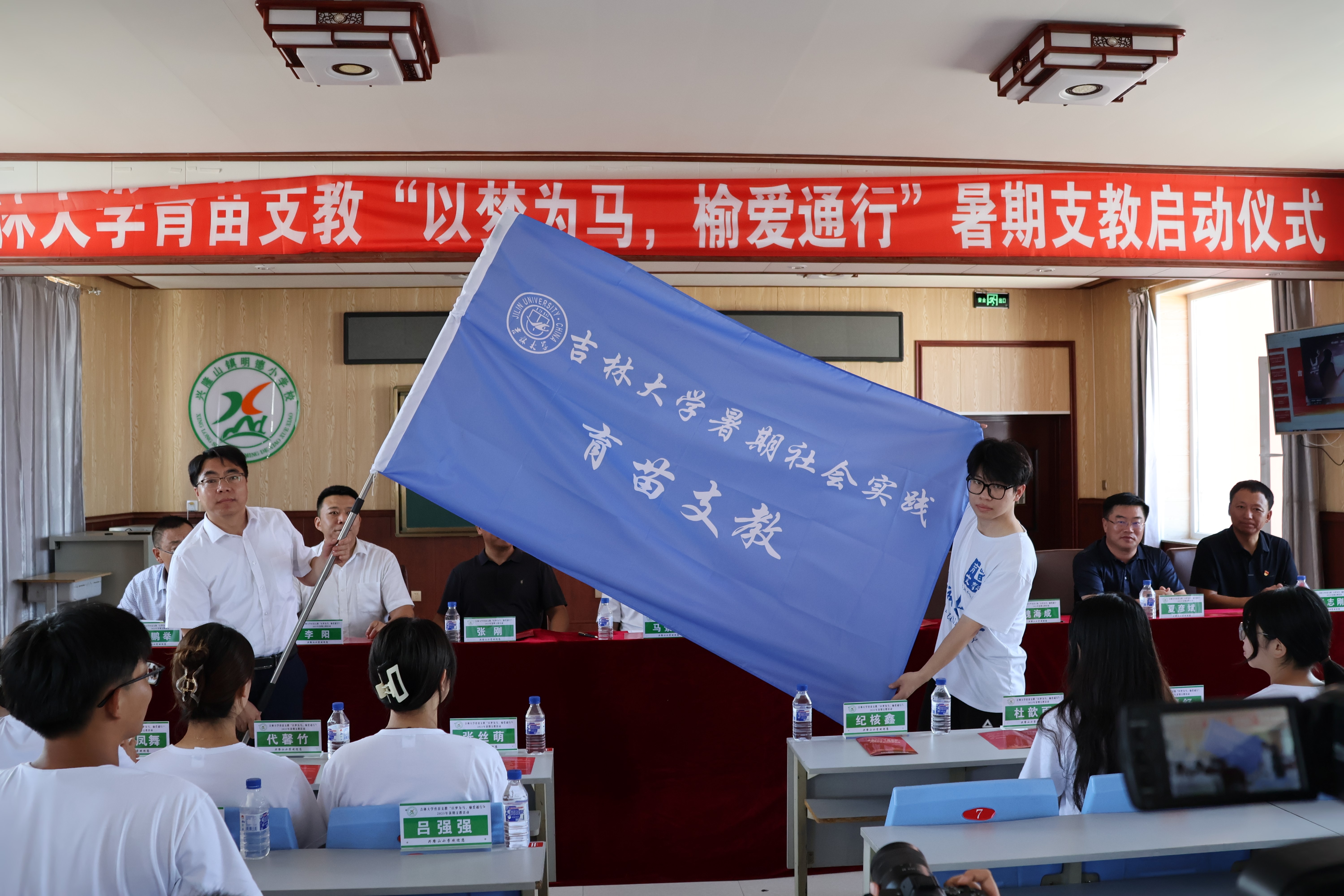 魏海成副书记向支教队队长吕强强进行“必赢bwin线路检测中心育苗支教社团暑期社会实践”授旗