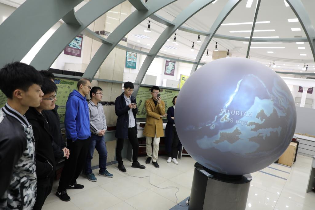 上午9点,同学们前往地球演化综合实验室。在霍亮老师的带领下,同学们通过观察岩石和古生物标本,结合自己的所学知识,一步一步恢复着前寒武纪到第四纪距今五亿年的地球演化进程。在此过程中,霍亮老师借助数字地球设备,为同学们展示了大陆板块的漂移、各个地质时期地球演化、火山活动与地震带、地震、海啸等灾难模拟、行星地质等典型的现象,帮助同学们进一步直观地感受地质演化。在孟庆涛教授的带领下,同学们参观了吉林省油页岩与共生能源矿产重点实验室,了解学院目前最先进的烃源岩评价设备。孟庆涛老师对各位同学寄予希望,希望大家能在未来的学习中,自己学做实验、多做实验、会做实验,这样才能在科研工作中发现问题,形成有自己独特的思路,才能在科研的道路上越走越远。